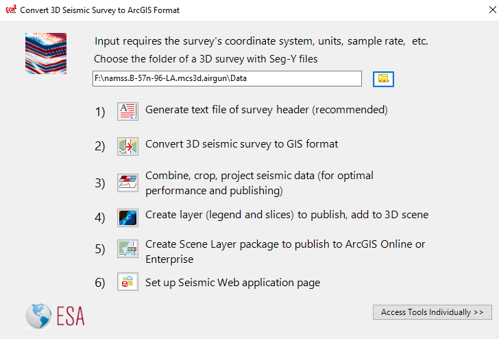 The many tools to make 3D seismic files GIS-ready, including seting up a web application to view 3D seismic data online, is contained in the window after clicking the Seismic Utilities button. The utilities can convert all files in a single folder (presumably representing a single 3D survey). At the top of the window, type or click the folder button to select a folder containing SEG-Y files.