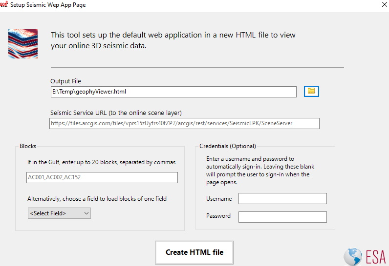 The last button launches another window used to put in parameters of the scene layer packaged in the last step. The first input saves a new HTML file, the second input is to fill in the URL of the published service. If in the Gulf of Mexico, the options on the left take in a list of blocks or a field to load existing GOM3 data. On the right, credentials to log in for the web service can be written into the HTML file. If shared outside of your organization, it is recommended not to include the credentials as it will be visible within the HTML.